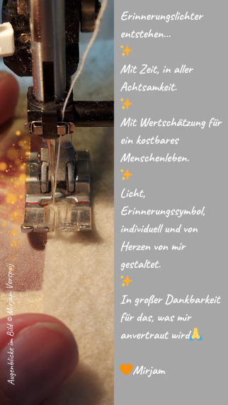Für die Herstellung solcher Erinnerungssymbole und die Begleitung von Menschen in ganz unterschiedlichen Wandlungsprozessen verbinde ich meine frühere Arbeit als Krankenschwester mit meiner Tätigkeit als Designerin/Gestalterin, als Trauer- & Wegbegleiterin, als Kunsttherapeutin und persönlichen Lebens- und Verlusterfahrungen.