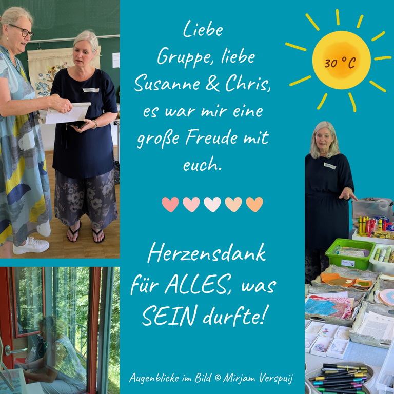 Mirjam hat uns nach allen Regeln der Kunst in ihre Kreativwelt entführt und ließ uns an ihrem Ideenreichtum, ihrer einzigartigen Herzlichkeit, ihrer inspirierenden Art und dem unfassbar riesigen Materialfundus teilhaben. So konnten wir uns nach Herzenslust kreativ austoben. Auch Diejenigen, die meinten, arg unkreativ zu sein, durften das Gegenteil erfahren. Voller Spaß, Hingabe und Fantasie tauchten alle in ihren eigenen kreativen Prozessen ab.